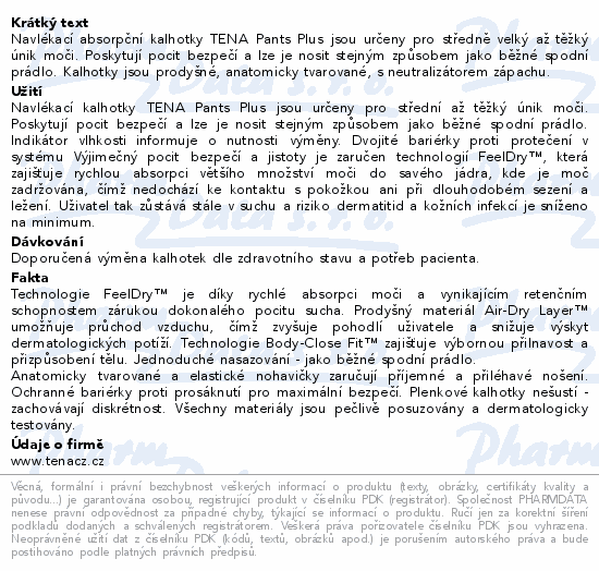 Navlékací absorpční kalhotky TENA Pants Plus jsou určeny pro středně velký až těžký únik moči. Poskytují pocit bezpečí a lze je nosit stejným způsobem jako běžné spodní prádlo. Kalhotky jsou prodyšné, anatomicky tvarované, s neutralizátorem zápachu.