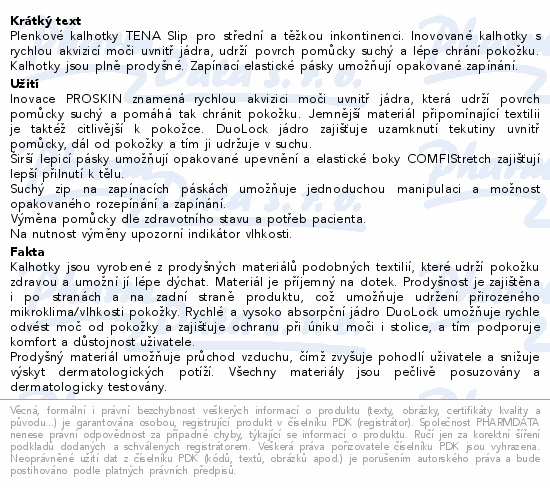 Plenkové kalhotky TENA Slip pro střední a těžkou inkontinenci. Inovované kalhotky s rychlou akvizicí moči uvnitř jádra, udrží povrch pomůcky suchý a lépe chrání pokožku. Kalhotky jsou plně prodyšné. Zapínací elastické pásky umožňují opakované zapínání.