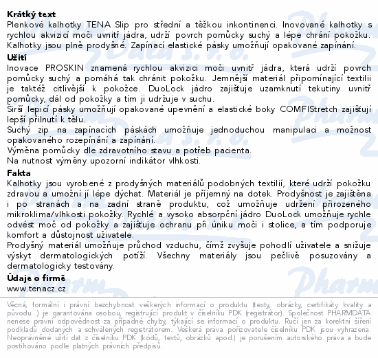 Plenkové kalhotky TENA Slip pro střední a těžkou inkontinenci. Inovované kalhotky s rychlou akvizicí moči uvnitř jádra, udrží povrch pomůcky suchý a lépe chrání pokožku. Kalhotky jsou plně prodyšné. Zapínací elastické pásky umožňují opakované zapínání.