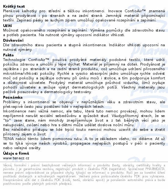 Plenkové kalhotky pro střední a těžkou inkontinenci. Inovace ConfioAir™ znamená plnou prodyšnost i po stranách a na zadní straně. Jemnější materiál připomínající textílii. Zapínací pásky se suchým zipem umožňují opakované rozepínání a zapínání.