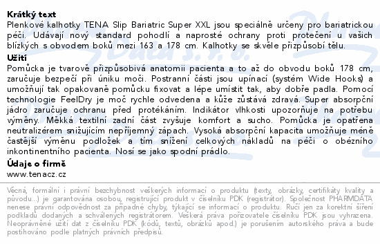 Plenkové kalhotky TENA Slip Bariatric Super XXL jsou speciálně určeny pro bariatrickou péči. Udávají nový standard pohodlí a naprosté ochrany proti protečení u vašich blízkých s obvodem boků mezi 163 a 178 cm. Kalhotky se skvěle přizpůsobí tělu.