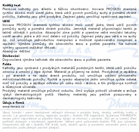 Plenkové kalhotky pro střední a těžkou inkontinenci. Inovace PROSKIN znamená rychlou akvizici moči uvnitř jádra, která udrží povrch pomůcky suchý a pomáhá chránit pokožku. Kalhotky jsou plně prodyšné. Zapínací pásky umožňují opakované zapínání.