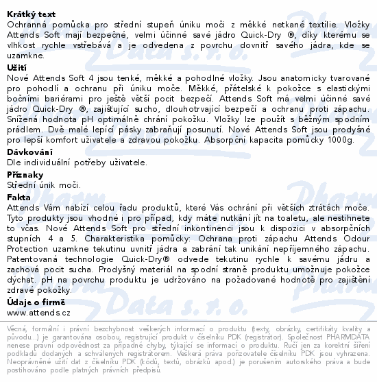 Ochranná pomůcka pro střední stupeň úniku moči z měkké netkané textílie. Vložky Attends Soft mají bezpečné, velmi účinné savé jádro Quick-Dry ®, díky kterému se vlhkost rychle vstřebává a je odvedena z povrchu dovnitř savého jádra, kde se uzamkne.