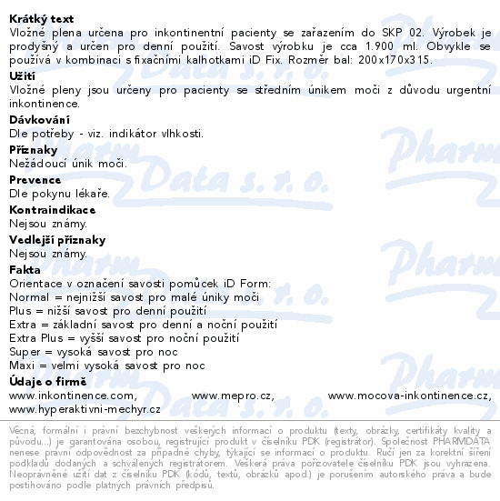 Vložné plena určena pro inkontinentní pacienty se zařazením do SKP 02. Výrobek je prodyšný a určen pro denní použití. Savost výrobku je cca 1.900 ml. Obvykle se používá v kombinaci s fixačními kalhotkami iD Fix. Rozměr bal: 200x170x315.