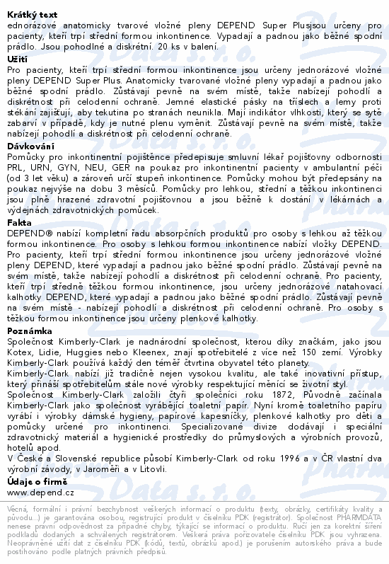 ednorázové anatomicky tvarové vložné pleny DEPEND Super Plusjsou určeny pro pacienty, kteří trpí střední formou inkontinence. Vypadají a padnou jako běžné spodní prádlo. Jsou pohodlné a diskrétní. 20 ks v balení.