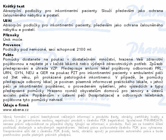 Absorpční podložky pro inkontinentní pacienty. Slouží především jako ochrana čalouněného nábytku a postelí.