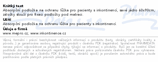 Absorpční podložka na ochranu lůžka pro pacienty s inkontinencí, savé jádro 60x90cm, záložky slouží pro fixaci podložky pod matraci.