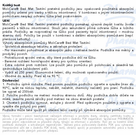 Opakovaně použitelná absorpční podložka MoliCare Bed Mat textile je určena pro osoby s těžkou inkontinencí. V kombinaci s jinými inkontinenčními pomůckami navyšuje ochranu lůžka před poskvrněním.