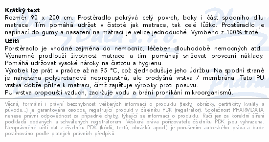 Rozměr 90 x 200 cm. Prostěradlo pokrývá celý povrch, boky i část spodního dílu matrace. Tím pomáhá udržet v čistotě jak matrace, tak celé lůžko. Prostěradlo je napínací do gumy a nasazení na matraci je velice jednoduché. Vyrobeno z 100% froté.
