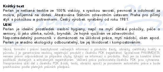 Perlan je netkaná textilie ze 100% viskózy, vysoká savost, pevnost a odolnost za mokra, příjemná na dotek, atestována Státním zdravotním ústavem Praha pro přímý styk s pokožkou a potravinami. Český výrobek vyráběný od roku 1981.