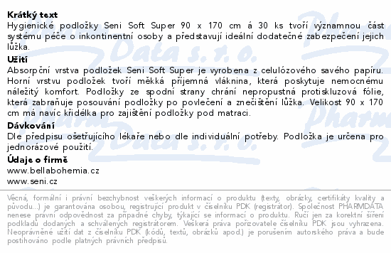 Hygienické podložky Seni Soft Super 90 x 170 cm á 30 ks tvoří významnou část systému péče o inkontinentní osoby a představují ideální dodatečné zabezpečení jejich lůžka.