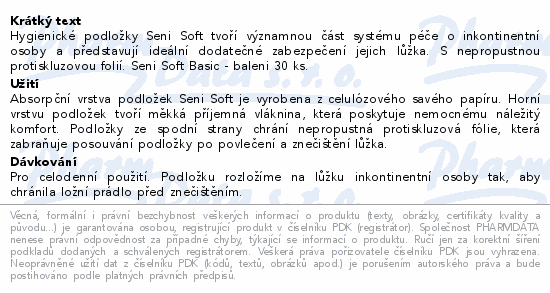 Hygienické podložky Seni Soft tvoří významnou část systému péče o inkontinentní osoby a představují ideální dodatečné zabezpečení jejich lůžka. S nepropustnou protiskluzovou folií. Seni Soft Basic - baleni 30 ks.