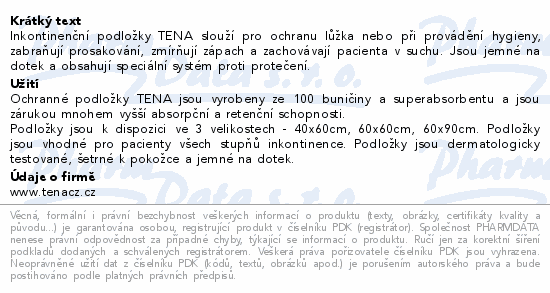 Inkontinenční podložky TENA slouží pro ochranu lůžka nebo při provádění hygieny, zabraňují prosakování, zmírňují zápach a zachovávají pacienta v suchu. Jsou jemné na dotek a obsahují speciální systém proti protečení.
