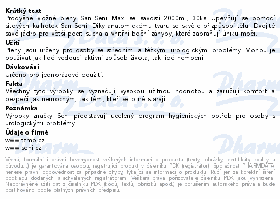 Prodyšné vložné pleny San Seni Maxi se savostí 2000ml, 30ks. Upevňují se pomocí síťových kalhotek San Seni. Díky anatomickému tvaru se skvěle přizpůsobí tělu. Dvojité savé jádro pro větší pocit sucha a vnitřní boční záhyby, které zabraňují úniku moči.