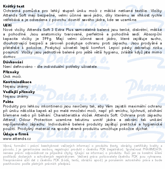 Ochranná pomůcka pro lehký stupeň úniku moči z měkké netkané textílie. Vložky Attends Soft mají bezpečné, velmi účinné savé jádro, díky kterému se vlhkost rychle vstřebává a je odvedena z povrchu dovnitř savého jádra, kde se uzamkne.