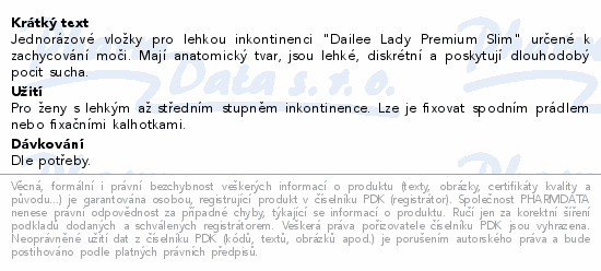 Jednorázové vložky pro lehkou inkontinenci "Dailee Lady Premium Slim" určené k zachycování moči. Mají anatomický tvar, jsou lehké, diskrétní a poskytují dlouhodobý pocit sucha.