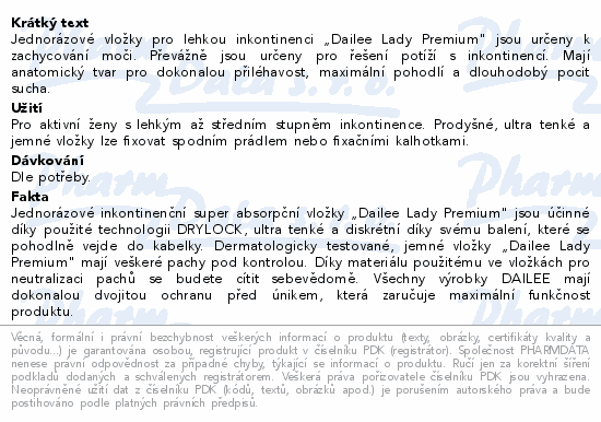 Jednorázové vložky pro lehkou inkontinenci „Dailee Lady Premium" jsou určeny k zachycování moči. Převážně jsou určeny pro řešení potíží s inkontinencí. Mají anatomický tvar pro dokonalou přiléhavost, maximální pohodlí a dlouhodobý pocit sucha.