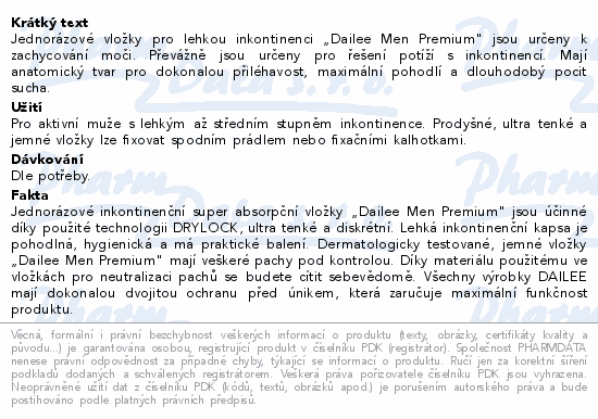 Jednorázové vložky pro lehkou inkontinenci „Dailee Men Premium" jsou určeny k zachycování moči. Převážně jsou určeny pro řešení potíží s inkontinencí. Mají anatomický tvar pro dokonalou přiléhavost, maximální pohodlí a dlouhodobý pocit sucha.