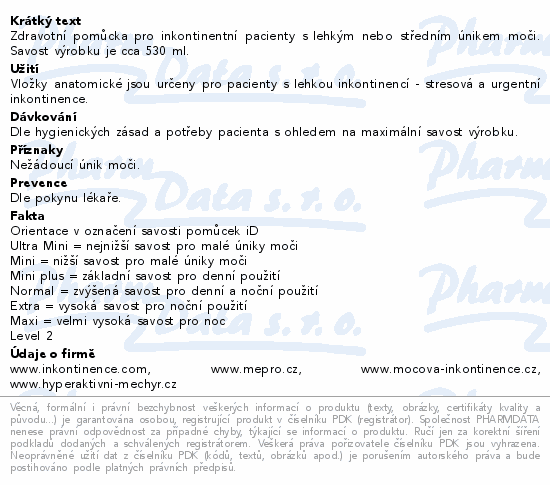 Zdravotní pomůcka pro inkontinentní pacienty s lehkým nebo středním únikem moči. Savost výrobku je cca 530 ml.