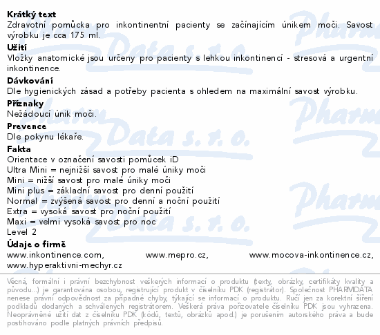 Zdravotní pomůcka pro inkontinentní pacienty se začínajícím únikem moči. Savost výrobku je cca 175 ml.