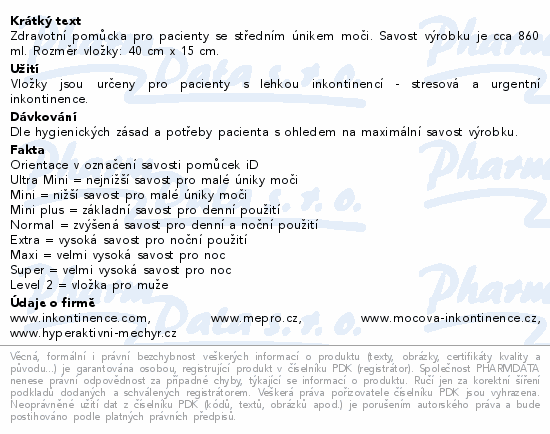 Zdravotní pomůcka pro pacienty se středním únikem moči. Savost výrobku je cca 860 ml. Rozměr vložky: 40 cm x 15 cm.