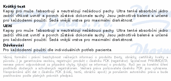 Kapsy pro muže 1absorbují a neutralizují nežádoucí pachy. Ultra tenké absorbční jádro zadrží vlhkost uvnitř a povrch zůstává dokonale suchý. Jsou jednotlivě balené a určené pro každodenní použití. Šedá vnější vrstva pro maximální disrkétnost.