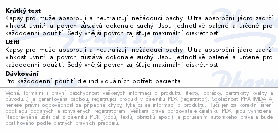 Kapsy pro muže absorbují a neutralizují nežádoucí pachy. Ultra absorbční jádro zadrží vlhkost uvnitř a povrch zůstává dokonale suchý. Jsou jednotlivě balené a určené pro každodenní použití. Šedý vnější povrch zajišťuje maximální diskrétnost.