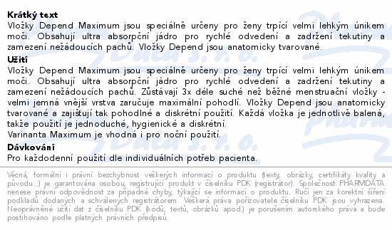 Vložky Depend Maximum jsou speciálně určeny pro ženy trpící velmi lehkým únikem moči. Obsahují ultra absorpční jádro pro rychlé odvedení a zadržení tekutiny a zamezení nežádoucích pachů. Vložky Depend jsou anatomicky tvarované.