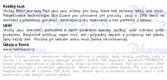 Vložky MoliCare lady Pad jsou jsou určeny pro ženy, které řeší občasný lehký únik moči. Patentovaná technologie SkinGuard pro přirozené pH pokožky. Jsou o 29% tenčí ve srovnání s předchozí generací, dermatologicky testované a bez parfémů a latexu.