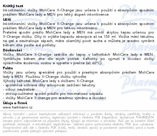 Inkontinenční vložky MoliCare X-Change jsou určena k použití s absorpčním spodním prádlem MoliCare lady a MEN pro lehký stupeň inkontinence.