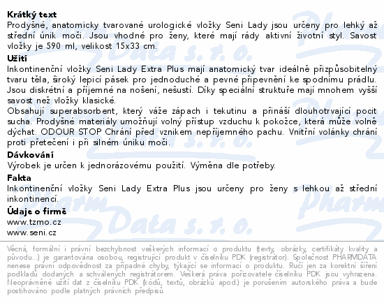 Prodyšné, anatomicky tvarované urologické vložky Seni Lady jsou určeny pro lehký až střední únik moči. Jsou vhodné pro ženy, které mají rády aktivní životní styl. Savost vložky je 590 ml, velikost 15x33 cm.