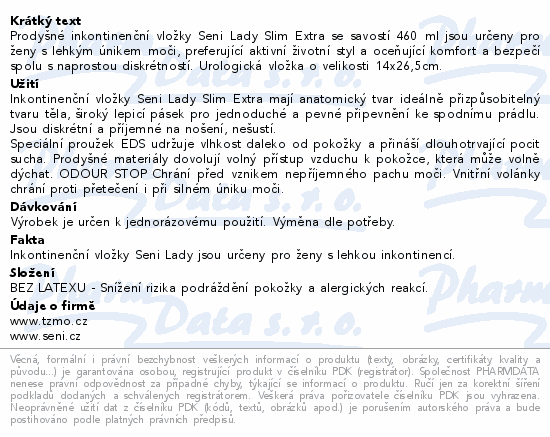 Prodyšné inkontinenční vložky Seni Lady Slim Extra se savostí 460 ml jsou určeny pro ženy s lehkým únikem moči, preferující aktivní životní styl a oceňující komfort a bezpečí spolu s naprostou diskrétností. Urologická vložka o velikosti 14x26,5cm.