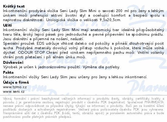 Inkontinenční prodyšná vložka Seni Lady Slim Mini o savosti 200 ml pro ženy s lehkým únikem moči preferující aktivní životní styl a oceňující komfort a bezpečí spolu s naprostou diskrétností. Urologická vložka o velikosti 9,5x20,5cm.
