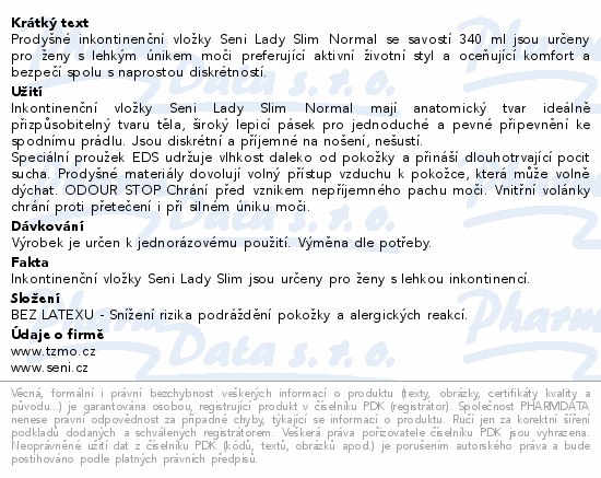 Prodyšné inkontinenční vložky Seni Lady Slim Normal se savostí 340 ml jsou určeny pro ženy s lehkým únikem moči preferující aktivní životní styl a oceňující komfort a bezpečí spolu s naprostou diskrétností.