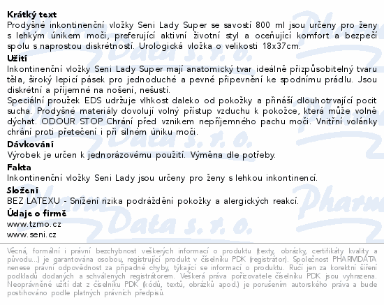 Prodyšné inkontinenční vložky Seni Lady Super se savostí 800 ml jsou určeny pro ženy s lehkým únikem moči, preferující aktivní životní styl a oceňující komfort a bezpečí spolu s naprostou diskrétností. Urologická vložka o velikosti 18x37cm.