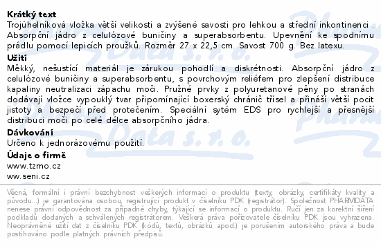 Trojúhelníková vložka větší velikosti a zvýšené savosti pro lehkou a střední inkontinenci . Absorpční jádro z celulózové buničiny a superabsorbentu. Upevnění ke spodnímu prádlu pomocí lepicích proužků. Rozměr 27 x 22,5 cm. Savost 700 g. Bez latexu.