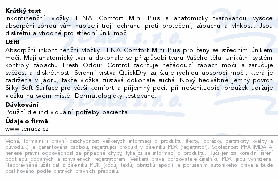 Inkontinenční vložky TENA Comfort Mini Plus s anatomicky tvarovanou vysoce absorpční zónou vám nabízejí trojí ochranu proti protečení, zápachu a vlhkosti. Jsou diskrétní a vhodné pro střední únik moči.