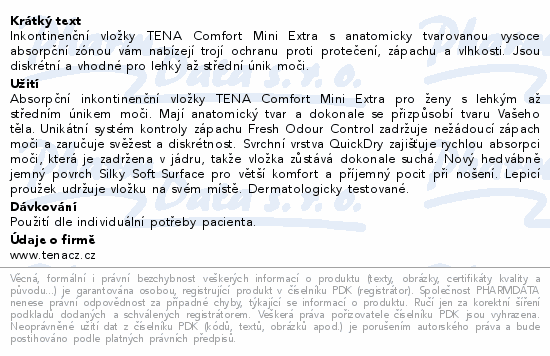 Inkontinenční vložky TENA Comfort Mini Extra s anatomicky tvarovanou vysoce absorpční zónou vám nabízejí trojí ochranu proti protečení, zápachu a vlhkosti. Jsou diskrétní a vhodné pro lehký až střední únik moči.
