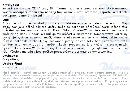 Inkontinenční vložky TENA Lady Slim Normal jsou ještě tenčí, s anatomicky tvarovanou vysoce absorpční zónou vám nabízejí TROJÍ OCHRANU proti protečení, zápachu a vlhkosti, dostupné i v menším balení. NOVINKA.