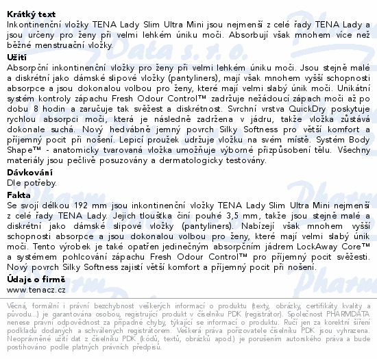 Inkontinenční vložky TENA Lady Slim Ultra Mini jsou nejmenší z celé řady TENA Lady a jsou určeny pro ženy při velmi lehkém úniku moči. Absorbují však mnohem více než běžné menstruační vložky.