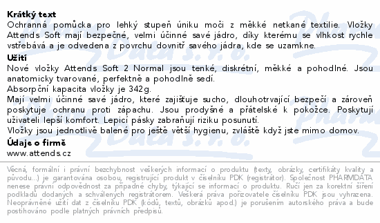 Ochranná pomůcka pro lehký stupeň úniku moči z měkké netkané textilie. Vložky Attends Soft mají bezpečné, velmi účinné savé jádro, díky kterému se vlhkost rychle vstřebává a je odvedena z povrchu dovnitř savého jádra, kde se uzamkne.