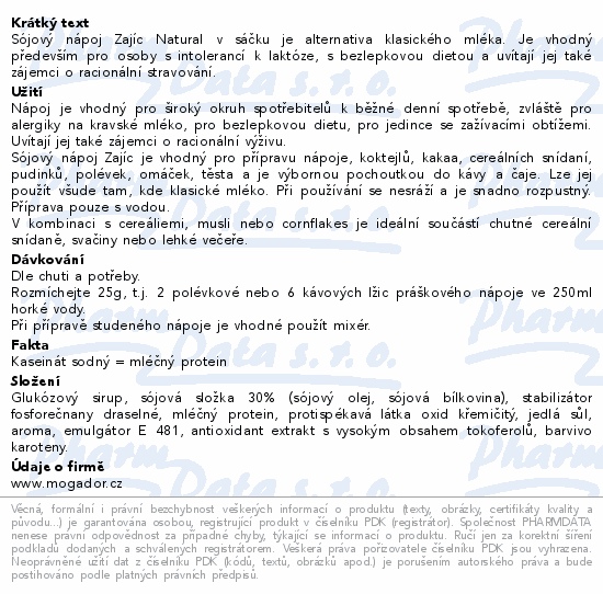 Sójový nápoj Zajíc Natural v sáčku je rostlinná alternativa klasického mléka. Je vhodný především pro osoby s intolerancí k laktóze, s bezlepkovou dietou a uvítají jej také zájemci o racionální stravování.