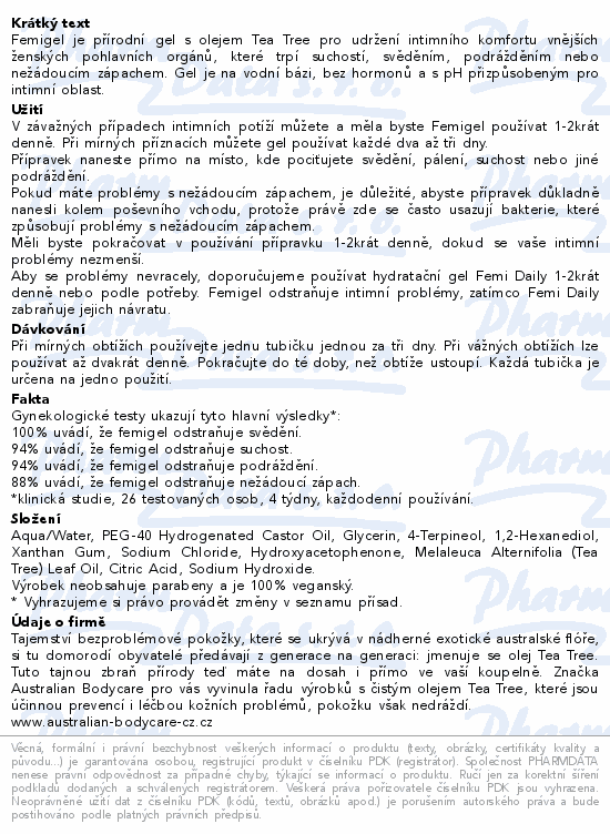 Femigel je přírodní gel s olejem Tea Tree pro udržení intimního komfortu vnějších ženských pohlavních orgánů, které trpí suchostí, svěděním, podrážděním nebo nežádoucím zápachem. Gel je na vodní bázi, bez hormonů a s pH přizpůsobeným pro intimní oblast.