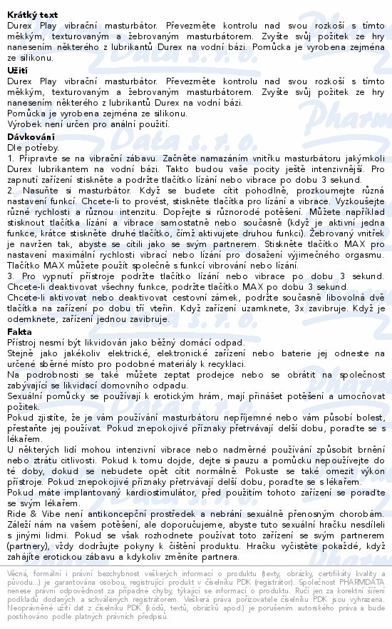 Durex Play vibrační masturbátor. Převezměte kontrolu nad svou rozkoší s tímto měkkým, texturovaným a žebrovaným masturbátorem. Zvyšte svůj požitek ze hry nanesením některého z lubrikantů Durex na vodní bázi. Pomůcka je vyrobena zejména ze silikonu.