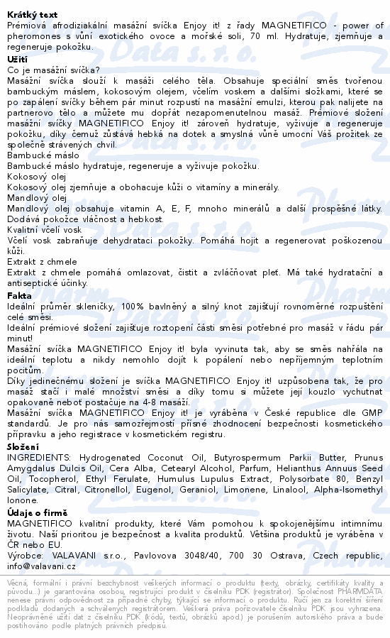Prémiová afrodiziakální masážní svíčka Enjoy it! z řady MAGNETIFICO - power of pheromones s vůní exotického ovoce a mořské soli, 70 ml. Hydratuje, zjemňuje a regeneruje pokožku.