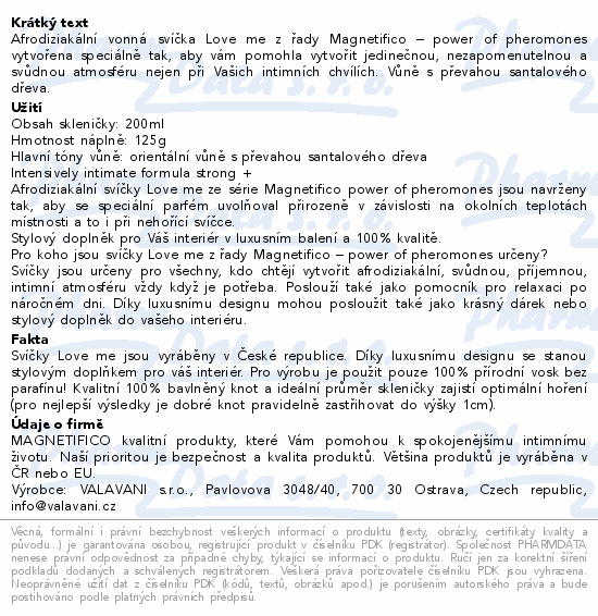 Afrodiziakální vonná svíčka Love me z řady Magnetifico – power of pheromones vytvořena speciálně tak, aby vám pomohla vytvořit jedinečnou, nezapomenutelnou a svůdnou atmosféru nejen při Vašich intimních chvílích. Vůně s převahou santalového dřeva.