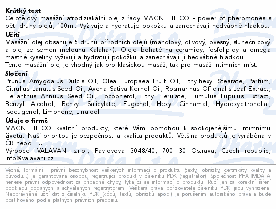 Celotělový masážní afrodiziakální olej z řady MAGNETIFICO - power of pheromones s pěti druhy olejů, 100ml. Vyživuje a hydratuje pokožku a zanechávají hedvábně hladkou.
