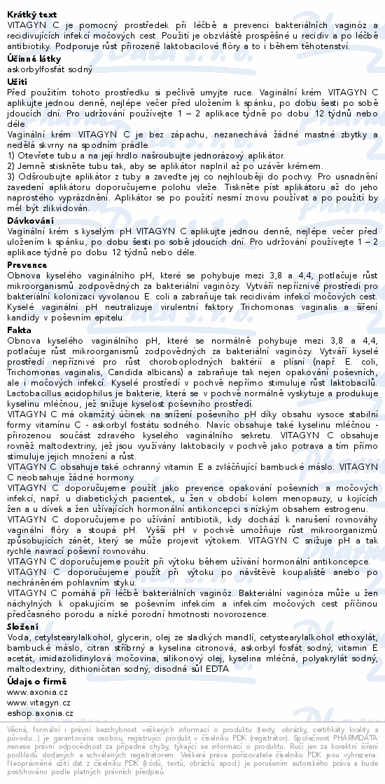 VITAGYN C je pomocný prostředek při léčbě a prevenci bakteriálních vaginóz a recidivujících infekcí močových cest. Použití je obzvláště prospěšné u recidiv a po léčbě antibiotiky. Podporuje růst přirozené laktobacilové flóry a to i během těhotenství.
