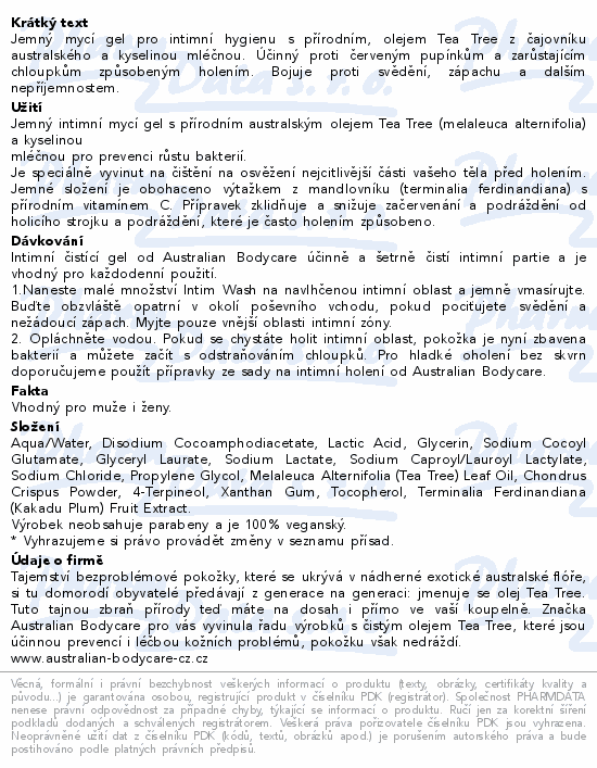 Jemný mycí gel pro intimní hygienu s přírodním, olejem Tea Tree z čajovníku australského a kyselinou mléčnou. Účinný proti červeným pupínkům a zarůstajícím chloupkům způsobeným holením. Bojuje proti svědění, zápachu a dalším nepříjemnostem.