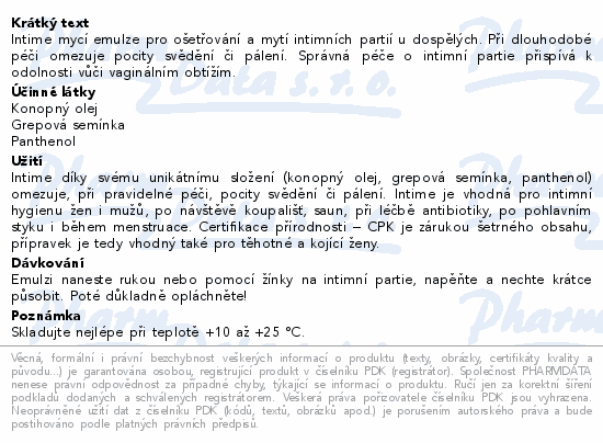 Intime mycí emulze pro ošetřování a mytí intimních partií u dospělých. Při dlouhodobé péči omezuje pocity svědění či pálení. Správná péče o intimní partie přispívá k odolnosti vůči vaginálním obtížím.